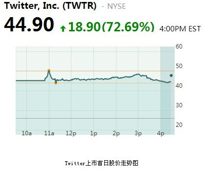 北京時間11月7日23:49,Twitter股票在(zai)紐交所正式開始交易(yi),開盤即(ji)報45.1美(mei)元,較(jiao)26美(mei)元的發(fa)行價上漲73%。當日盤中交易(yi)中,Twitter股價最高為50.09美(mei)元,最低為44美(mei)元。