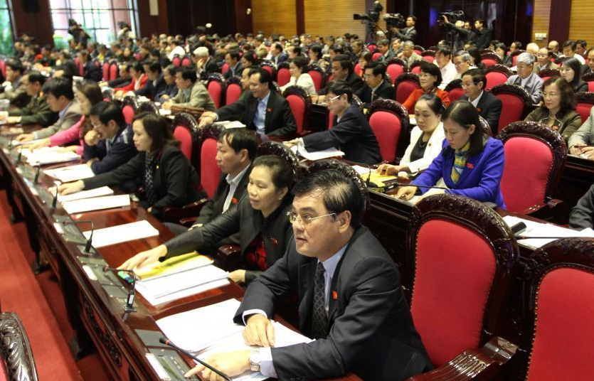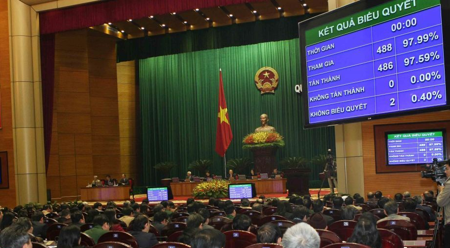 這是在越南首都河內舉行的第十三屆越南國會第六次會議現場(11月28日攝)。當日,第十三屆越南國會第六次會議以97.59%贊成票正式通過《1992年憲法修正草案》(《越南社會主義共和國憲法全文》),重申了越共在國家政治經濟上的領導地位。