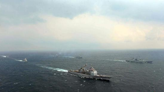 當地時間2014年3月14日,韓國東海,韓國與美國軍艦參加韓美2014“鷂鷹”聯合軍演。