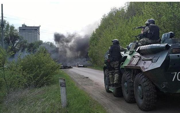 當地時間2014年4月24日,烏克蘭士兵進攻頓涅茨克州斯拉維亞斯克市3處由不明武裝分子設置的封鎖點,在武裝沖突過程中,5名武裝分子被擊斃,1名烏方警察受傷。”