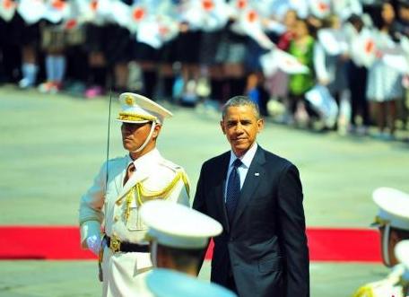 4月24日上午,日本皇宮內為奧巴馬來訪舉行歡迎儀式,奧巴馬檢閱儀仗隊。 以“國賓”身份23日晚間抵達東京的美國總統奧巴馬,24日開始其亞洲四國訪問行程。