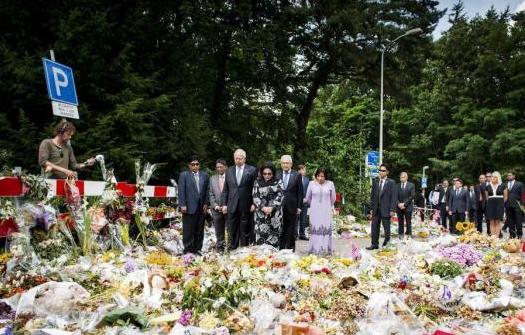 014年7月31日,荷蘭希爾弗瑟姆,馬來西亞總理納吉布攜妻子在當地一處軍事基地外獻花。法醫專家正在該基地內對馬航MH17失事航班遇難者的遺體進行辨認和恢復。