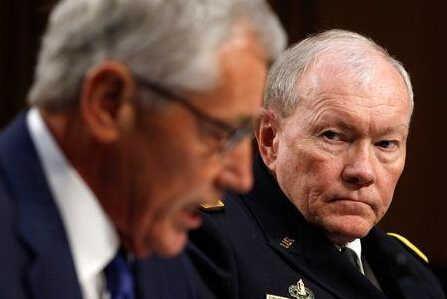 美軍參謀長聯席會議主席鄧普西(右)稱,有可能建議美國總統考慮派出地面部隊,打擊“伊斯蘭國”極端組織。