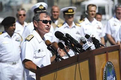當地時間6月30日,美國夏威夷火奴魯魯,環太平洋軍演在珍珠港聯合基地開幕,美國海軍上將哈里斯出席新聞發布會。