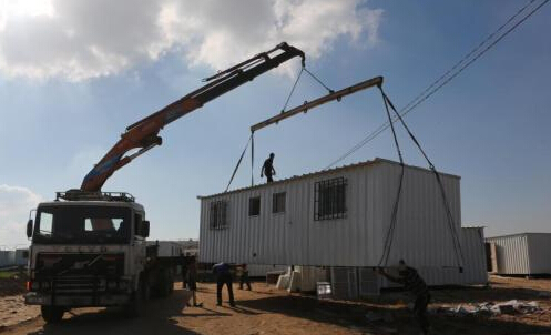 當地時間2014年9月13日,加沙汗尤尼斯工人們正在安置活動板房,以暫時代替在近期巴以沖突中被損毀的房屋。