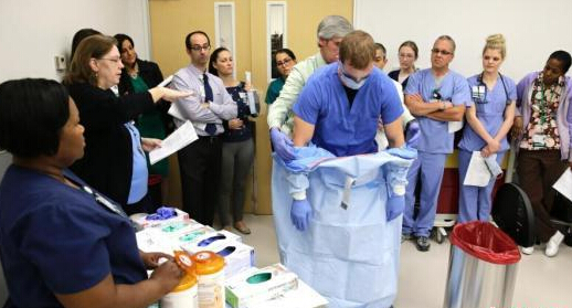 當地時間2014年10月16日,美國芝加哥拉什大學醫療中心,護士Keene Roadman和Fred Serafin向照顧埃博拉病毒患者的護士們演示正確的防護步驟,以避免和減少因照顧埃博拉患者而感染病毒的幾率。