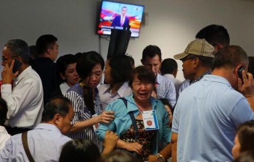 當地時間2014年12月30日,印尼泗水,失聯亞航QZ8501航班乘客家屬在得知印尼搜救隊發現飛機殘骸后悲痛欲絕。印尼國家搜救中心當天下午舉行新聞發布會,中心負責人蘇利斯提約在發布會上說,搜救人員在該海域發現飛機艙門等物品及遇難者遺體。他說,事發海域水深25至30米,將調集所有搜救力量前往該區域進行打撈。