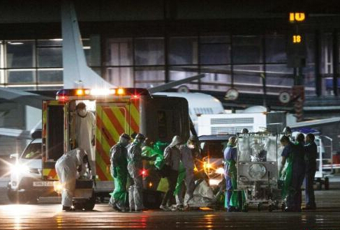 圖為當地時間12月30日,格拉斯哥機場,這名埃博拉確診患者在被移上專機送往倫敦接受治療。