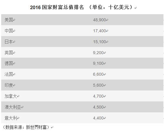 美國(guo)(guo)以48.9萬(wan)(wan)億(yi)美元(約合人民幣327萬(wan)(wan)億(yi)元)財富總(zong)值高居榜首,接下來依(yi)次是(shi)中國(guo)(guo)、日本、英國(guo)(guo)、德國(guo)(guo)、法國(guo)(guo)、印度(du)、加拿(na)大、澳大利亞和(he)意大利。