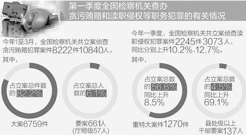 “據統計,今年1至3月,全國檢察機關共立案偵查貪污賄賂犯罪案件8222件10840人。其中,大案6759件,占立案總件數的82.2%;要案661人,其中包括廳局級57人,占立案總人數的6.1%。” 最高人民檢察院反貪污賄賂總局局長徐進輝表示,全國檢察機關認真貫徹落實中央反腐敗決策部署,堅持有案必查、有腐必懲,反貪辦案工作取得明顯進展。