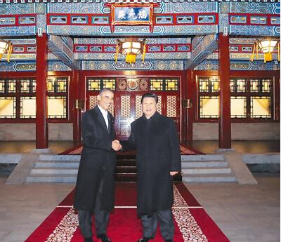 晚上的中南海,水波蕩漾,樹影婆娑。習近平在瀛臺前迎接奧巴馬,兩國元首親切握手,互致問候。習近平歡迎奧巴馬來華出席亞太經合組織領導人非正式會議并對中國進行國事訪問。習近平說,你這次訪問日程很緊。我們既安排了國事訪問的正式活動,也安排了一些輕松場合。希望你的訪問愉快,取得豐碩成果。奧巴馬表示,很高興再次對中國進行國事訪問,祝賀中國成功舉辦亞太經合組織領導人非正式會議。