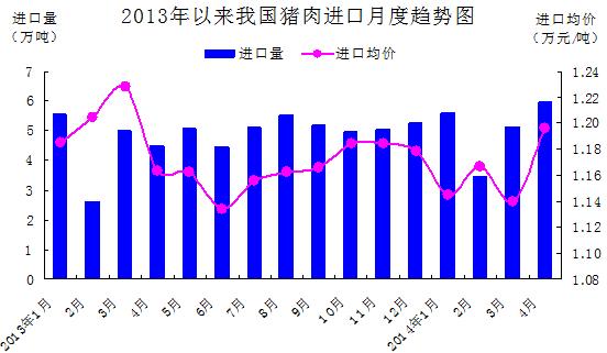 據海關統計,今年前4個月,我國累計進口豬肉20.2萬噸,比去年同期增加14.1%;價值23.4億元人民幣,增長11%;進口平均價格為千克11.6元,下跌2.7%。4月當月進口豬肉6萬噸,增加32.2%,進口均價每千克12元,上漲2.9%。