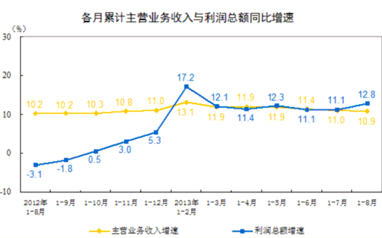 人民網北京9月27日電 (聶叢笑)今天,國家統計局發布數據顯示,1-8月份,全國規模以上工業企業實現利潤總額34863.9億元,比去年同期增長12.8%,增速比1-7月份提高1.7個百分點,其中,主營活動利潤[1]35800.6億元,比去年同期增長4.9%,增速比1-7月份回落0.2個百分點。