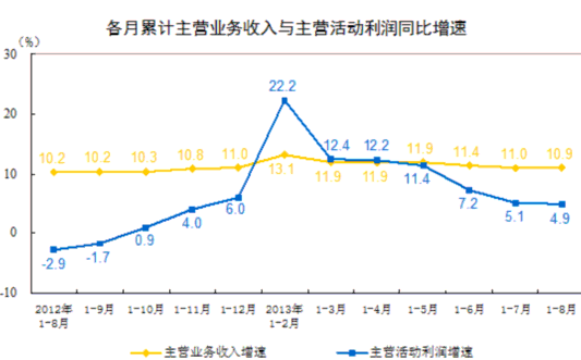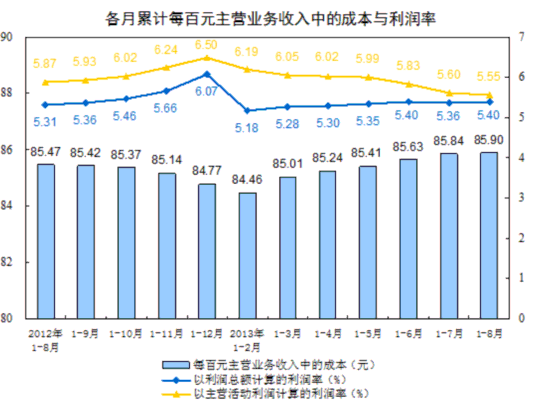 1-8月份,規模以上工業企業實現主營業務收入645058.5億元,比去年同期增長10.9%。每百元主營業務收入中的成本為85.9元,以利潤總額計算的利潤率為5.4%,以主營活動利潤計算的利潤率為5.55%。