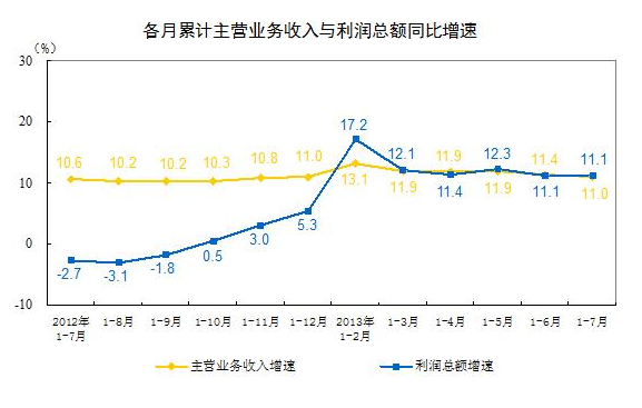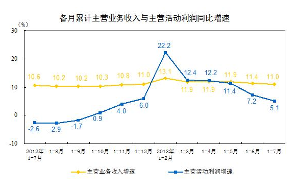 1-7月份,全國規模以上工業企業實現利潤總額30032.2億元,比去年同期增長11.1%,增速與1-6月份持平,其中,主營活動利潤[1]31346.8億元,比去年同期增長5.1%,增速比1-6月份回落2.1個百分點。