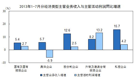 1-7月份,在規模以上工業企業中,國有及國有控股企業實現主營業務收入143404.4億元,比去年同期增長5.4%,每百元主營業務收入中的成本為82.85元,利潤率(以主營活動利潤計算的利潤率,下同)為5.08%;集體企業實現主營業務收入6517.9億元,增長5.7%,每百元主營業務收入中的成本為85.95元,利潤率為7.34%;股份制企業實現主營業務收入329230.1億元,增長12.6%,每百元主營業務收入中的成本為85.71元,利潤率為5.6%;外商及港澳臺商投資企業實現主營業務收入133311.5億元,增長8.2%,每百元主營業務收入中的成本為86.41元,利潤率為5.1%;私營企業實現主營業務收入175832.9億元,增長15.7%,每百元主營業務收入中的成本為87.25元,利潤率為6.39%。