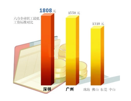 深圳5年來多次調高最低工資水平,從08年的1000元,到2013年的1600元,再到2014年的1808元,深圳工資最低工資標準一致領漲全國。