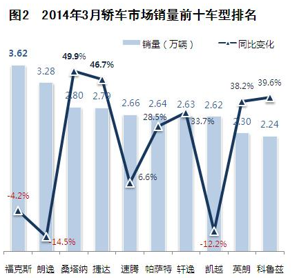 桑塔納3月銷量提升最快,同比增長五成至2.80萬輛,僅低于福克斯和朗逸,晉升前三。其次是捷達,銷量同比增長46.7%至2.79萬輛,排名躍至第四位。此外,帕薩特、軒逸、英朗和科魯茲分別增長28.5%、33.7%、38.2%和39.6%,銷量提升也較多。