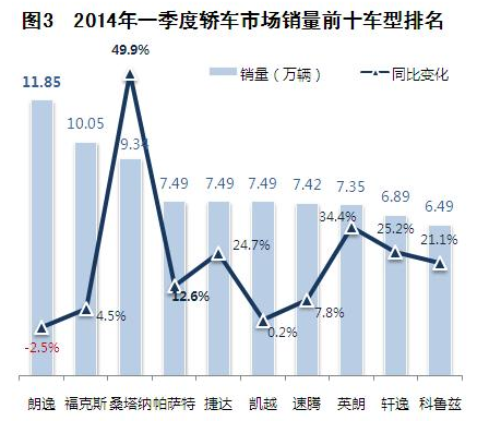 桑塔納一季度銷量激增91.3%,增幅最高,銷量由4.88萬輛增至9.34萬輛,晉升前三,新款桑塔納銷量的攀升是其增長的主要因素。捷達、英朗、軒逸和科魯茲銷量提升也較快,均以20%-40%以內的增幅增長。