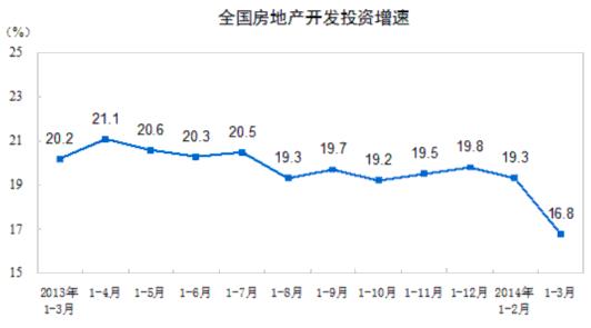 北京4月16日電 今日,國家統計局公布2014年一季度經濟數據顯示,2014年1-3月份,全國房地產開發投資15339億元,同比名義增長16.8%(扣除價格因素實際增長15.5%),增速比1-2月份回落2.5個百分點。其中,住宅投資10530億元,增長16.8%,增速回落1.6個百分點,占房地產開發投資的比重為68.7%。