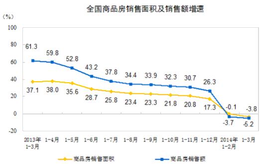 1-3月份,商品房銷售面積20111萬平方米,同比下降3.8%;降幅比1-2月份擴大3.7個百分點;其中,住宅銷售面積下降5.7%,辦公樓銷售面積增長6.7%,商業營業用房銷售面積增長6.0%。商品房銷售額13263億元,下降5.2%,降幅比1-2月份擴大1.5個百分點;其中,住宅銷售額下降7.7%,辦公樓銷售額下降10.6%,商業營業用房銷售額增長7.9%。