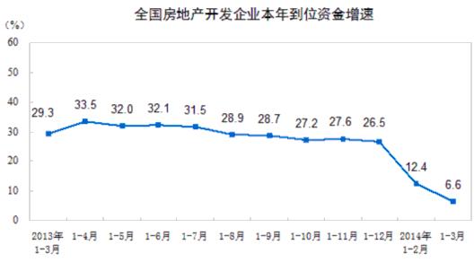 1-3月份,房地產開發企業到位資金28731億元,同比增長6.6%,增速比1-2月份回落5.8個百分點。其中,國內貸款6226億元,增長20.4%;利用外資84億元,下降33.9%;自籌資金11093億元,增長9.6%;其他資金11327億元,下降1.9%。在其他資金中,定金及預收款6837億元,下降3.6%;個人按揭貸款3161億元,增長0.1%。