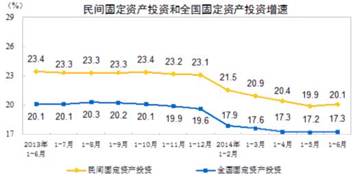 北京7月16日電 今日,國家統計局公布數據顯示,2014年1-6月份,民間固定資產投資138607億元,同比名義增長20.1%(扣除價格因素實際增長19%),增速比1-5月份加快0.2個百分點。民間固定資產投資占全國固定資產投資(不含農戶)的比重為65.1%,與1-5月份持平。