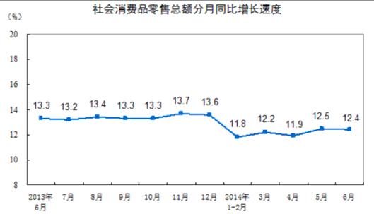 北京7月16日電 今日,國家統計局公布數據顯示,2014年6月份,社會消費品零售總額21166億元,同比名義增長12.4%(扣除價格因素實際增長10.7%,以下除特殊說明外均為名義增長)。其中,限額以上單位消費品零售額11103億元,增長10.2%。1-6月份,社會消費品零售總額124199億元,同比增長12.1%。其中,限額以上單位網上零售額[1]1819億元,增長56.3%。