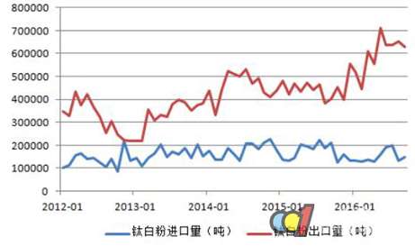 2012-2016年中國鈦白(bai)粉(fen)進出口量(liang)