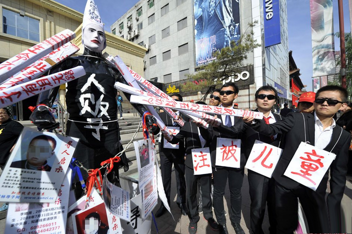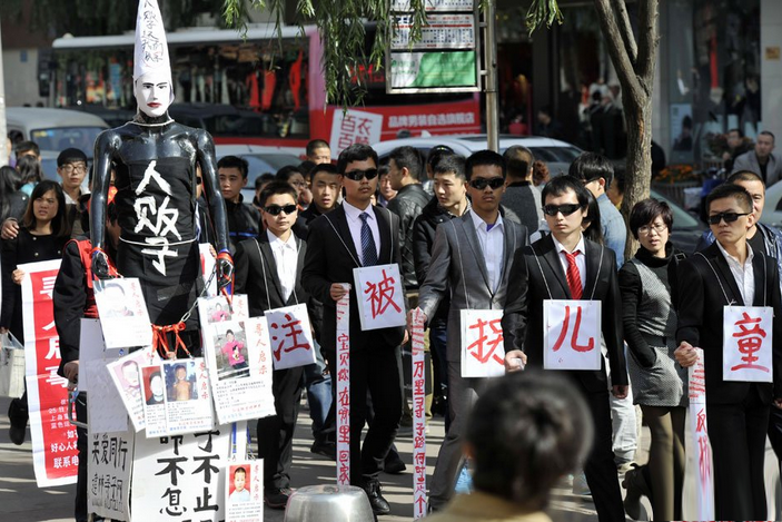 10月20日,山西太原繁華鬧市現行為藝術“人販子游街”,民眾關注被拐兒童信息。
