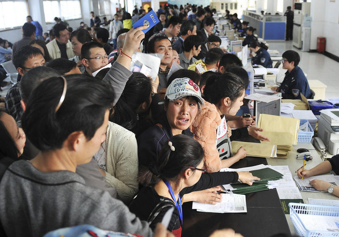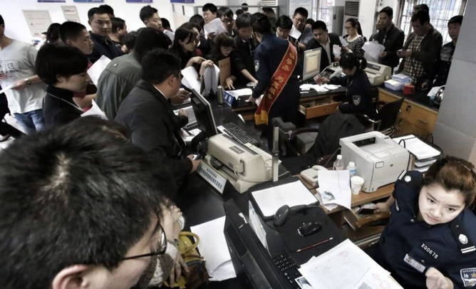 2014年3月24日,在杭州市汽車城,等待車輛檢測、交稅以及選號上牌的各個服務窗口人滿為患。