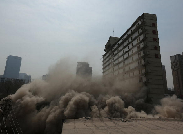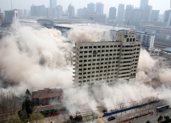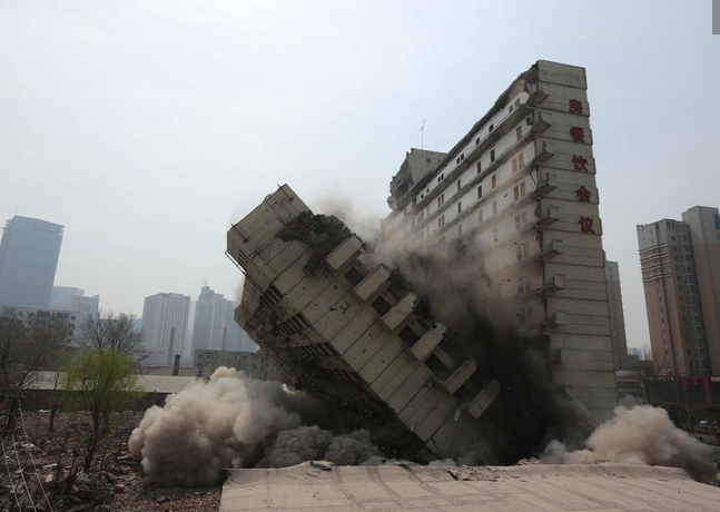 2014年04月08日,遼寧省沈陽市,4月8日11點25分,被“剪半”的沈陽地標性翔云樓倒下,剩余部分將于兩日內除。“倒樓”中使用最基礎的機械拆除法,使用吊錘、鉤機等設備。