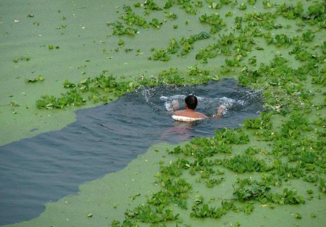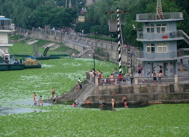 7月10日,從漢江上游漂浮而下的浮萍等水生植物至今已持續存在近一個月之久,目前仍未有消退的跡象。在漢口江漢一橋附近,幾個碼頭周邊水域全被水華覆蓋。盡管如此,仍有不少愛水的市民在此納涼、戲水、釣魚,成為獨特的都市風景。