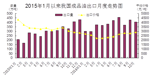 據海關統(tong)計,今年(nian)1-10月我國出口成品3812萬(wan)噸,比去年(nian)同期(下(xia)同)增加37.4%;價值(zhi)(zhi)977.1億元(yuan)(yuan)人(ren)民幣,增長3.6%;出口平均價格為每(mei)噸2564元(yuan)(yuan),下(xia)跌24.6%。其中10月當月我國出口成品油406.7萬(wan)噸,增加24.1%;價值(zhi)(zhi)118.2億元(yuan)(yuan)人(ren)民幣,增長18.4%;出口平均價格為每(mei)噸2907元(yuan)(yuan),下(xia)跌4.5%。