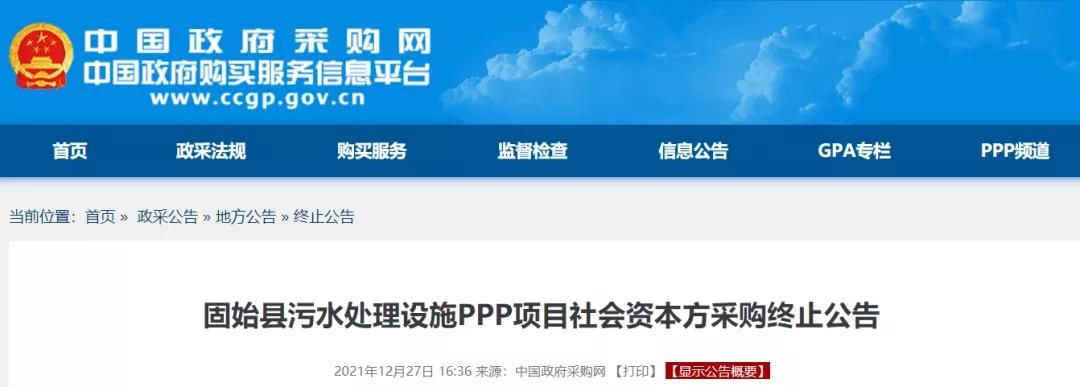 近日,中國水網獲悉,河南、黑龍江等地多個環保PPP項目發布終止公告。如河南省南陽市桐柏縣城區供水工程PPP項目、固始縣污水處理設施PPP項目近日相繼發布了終止招標的公告。