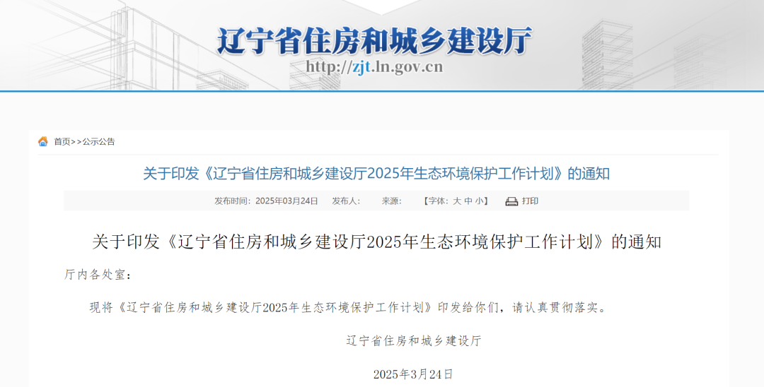 關于印發《遼寧省住房和城鄉建設廳2025年生態環境保護工作計劃》的通知