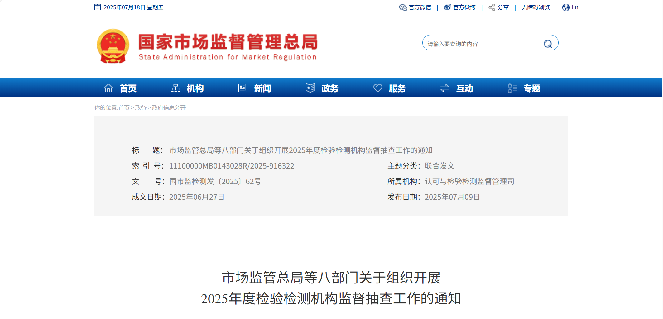 市場監管總局等八部門關于組織開展2025年度檢驗檢測機構監督抽查工作的通知