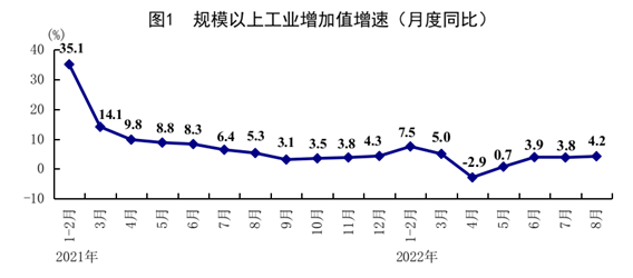 8月份,全國規模以上工業增加值同比增長4.2%,比上月加快0.4個百分點;環比增長0.32%。分三大門類看,采礦業增加值同比增長5.3%,制造業增長3.1%,電力、熱力、燃氣及水生產和供應業增長13.6%。裝備制造業同比增長9.5%,比上月加快1.1個百分點。分經濟類型看,國有控股企業增加值同比增長5.6%;股份制企業增長4.1%,外商及港澳臺商投資企業增長4.0%;私營企業增長1.1%。分產品看,新能源汽車、移動通信基站設備、太陽能電池等綠色智能產品產量同比分別增長117.0%、25.7%、21.6%。1-8月份,全國規模以上工業增加值同比增長3.6%,比1-7月份加快0.1個百分點。8月份,制造業采購經理指數為49.4%,比上月上升0.4個百分點;企業生產經營活動預期指數為52.3%,上升0.3個百分點。1-7月份,全國規模以上工業企業實現利潤總額48930億元,同比下降1.1%。