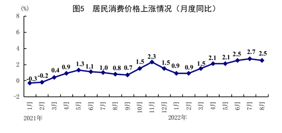 8月份,全國居民消費價格(CPI)同比上漲2.5%,漲幅比上月回落0.2個百分點;環比下降0.1%。分類別看,食品煙酒價格同比上漲4.5%,衣著價格上漲0.6%,居住價格上漲0.6%,生活用品及服務價格上漲1.3%,交通通信價格上漲4.9%,教育文化娛樂價格上漲1.6%,醫療保健價格上漲0.7%,其他用品及服務價格上漲2.2%。在食品煙酒價格中,糧食價格上漲3.3%,鮮菜價格上漲6.0%,鮮果價格上漲16.3%,豬肉價格上漲22.4%。扣除食品和能源價格后的核心CPI同比上漲0.8%,漲幅與上月相同。1-8月份,全國居民消費價格同比上漲1.9%。