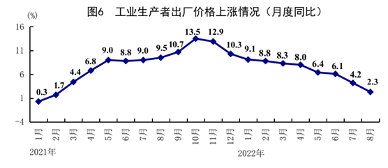 8月份,全國工業生產者出廠價格同比上漲2.3%,漲幅比上月回落1.9個百分點;環比下降1.2%。工業生產者購進價格同比上漲4.2%,環比下降1.4%。1-8月份,全國工業生產者出廠價格、工業生產者購進價格同比分別上漲6.6%、9.1%。