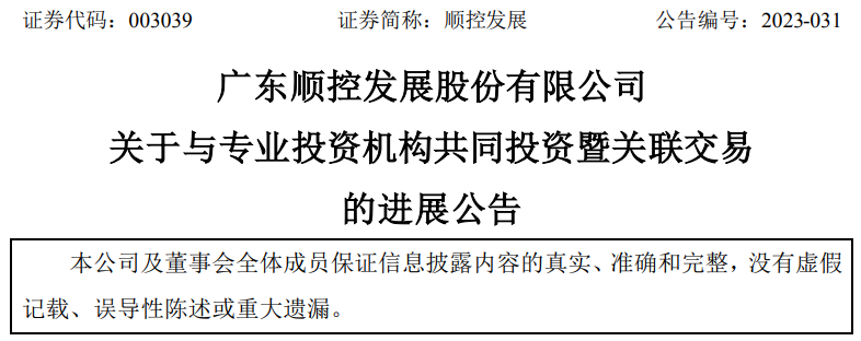 9月(yue)28日,順(shun)控(kong)發(fa)(fa)展發(fa)(fa)布公告,順(shun)控(kong)發(fa)(fa)展與廣東恒健(jian)國際投資(zi)(zi)有(you)限公司(以(yi)(yi)下簡稱“恒健(jian)國際”)、廣東順(shun)德上市公司高質量發(fa)(fa)展基金合(he)(he)伙(huo)企業(有(you)限合(he)(he)伙(huo))(以(yi)(yi)下簡稱“順(shun)德高質量發(fa)(fa)展基金”)共(gong)同(tong)投資(zi)(zi)設立合(he)(he)伙(huo)企業,全(quan)體合(he)(he)伙(huo)人(ren)對合(he)(he)伙(huo)企業的認(ren)繳出(chu)資(zi)(zi)總額為(wei)(wei)人(ren)民幣20.01億元,其中順(shun)控(kong)發(fa)(fa)展作(zuo)為(wei)(wei)有(you)限合(he)(he)伙(huo)人(ren)以(yi)(yi)自有(you)資(zi)(zi)金認(ren)繳出(chu)資(zi)(zi)的金額為(wei)(wei)人(ren)民幣10億元,出(chu)資(zi)(zi)占(zhan)比(bi)為(wei)(wei) 49.975%。