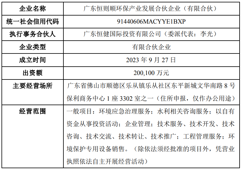 據了解(jie),2023年9月27日,順(shun)控發展(zhan)與恒健(jian)國際、順(shun)德高(gao)質量發展(zhan)基金簽署了《廣東恒則(ze)順(shun)環保產業(ye)發展(zhan)合(he)伙(huo)企業(ye)(有(you)限(xian)合(he)伙(huo))合(he)伙(huo)協議》,同日,廣東恒則(ze)順(shun)環保產業(ye)發展(zhan)合(he)伙(huo)企業(ye)(有(you)限(xian)合(he)伙(huo))(以下簡稱“恒則(ze)順(shun)合(he)伙(huo)企業(ye)”)完成了工商登(deng)記(ji)注(zhu)冊手續并取得了佛山市(shi)順(shun)德區(qu)市(shi)場監督管理局頒發的《營(ying)業(ye)執照》,登(deng)記(ji)的具體內容如下: