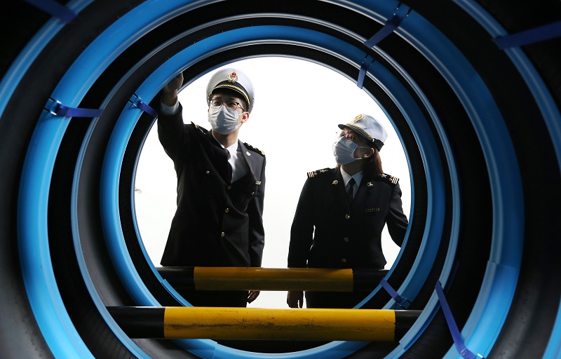 圖為:關員在輪胎生產出口企業現場調研 鮑曉康/攝