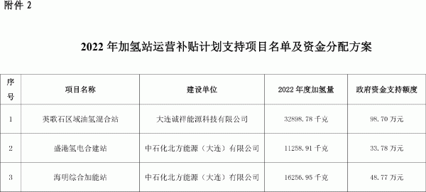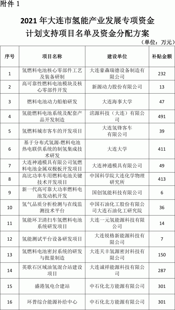 關于2021年大連市氫能產業發展專項資金、2022年加氫站運營補貼計劃支持項目名單和資金分配方案的公示
