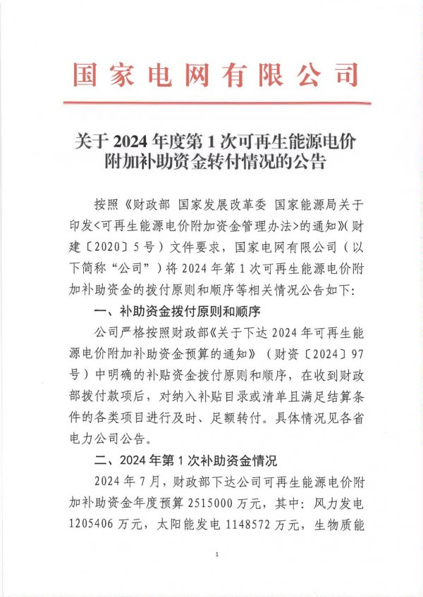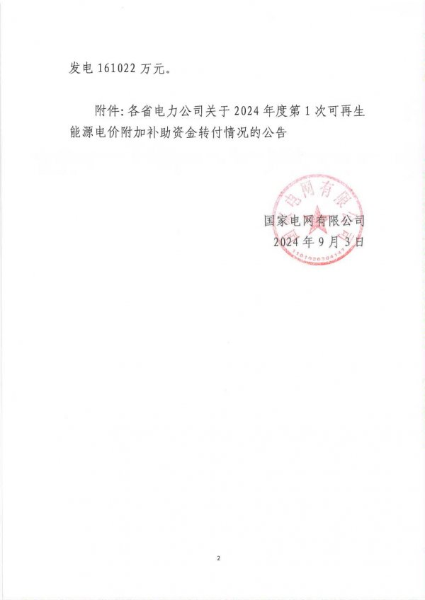 9月3日,國家電(dian)網有(you)限公(gong)(gong)司公(gong)(gong)告2024年度(du)第1次可(ke)再(zai)生能(neng)源電(dian)價附加補助(zhu)資金轉付情況。
