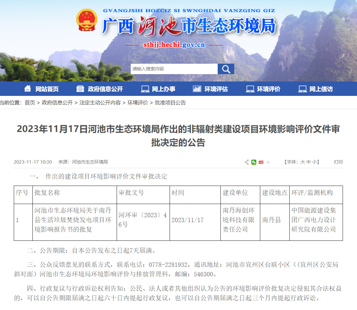 近日,河池市(shi)生(sheng)態環(huan)(huan)(huan)境(jing)局(ju)發布《河池市(shi)生(sheng)態環(huan)(huan)(huan)境(jing)局(ju)關于(yu)南丹(dan)(dan)(dan)縣生(sheng)活垃(la)圾焚(fen)燒發電(dian)項目環(huan)(huan)(huan)境(jing)影響報(bao)告(gao)書的批復》。2022年9月,南丹(dan)(dan)(dan)縣人民政府與南丹(dan)(dan)(dan)海(hai)創環(huan)(huan)(huan)境(jing)科技有限(xian)責(ze)任公司簽訂(ding)投(tou)資協議(yi),由(you)南丹(dan)(dan)(dan)海(hai)創環(huan)(huan)(huan)境(jing)科技有限(xian)責(ze)任公司為建(jian)設(she)(she)單位推進項目建(jian)設(she)(she)。