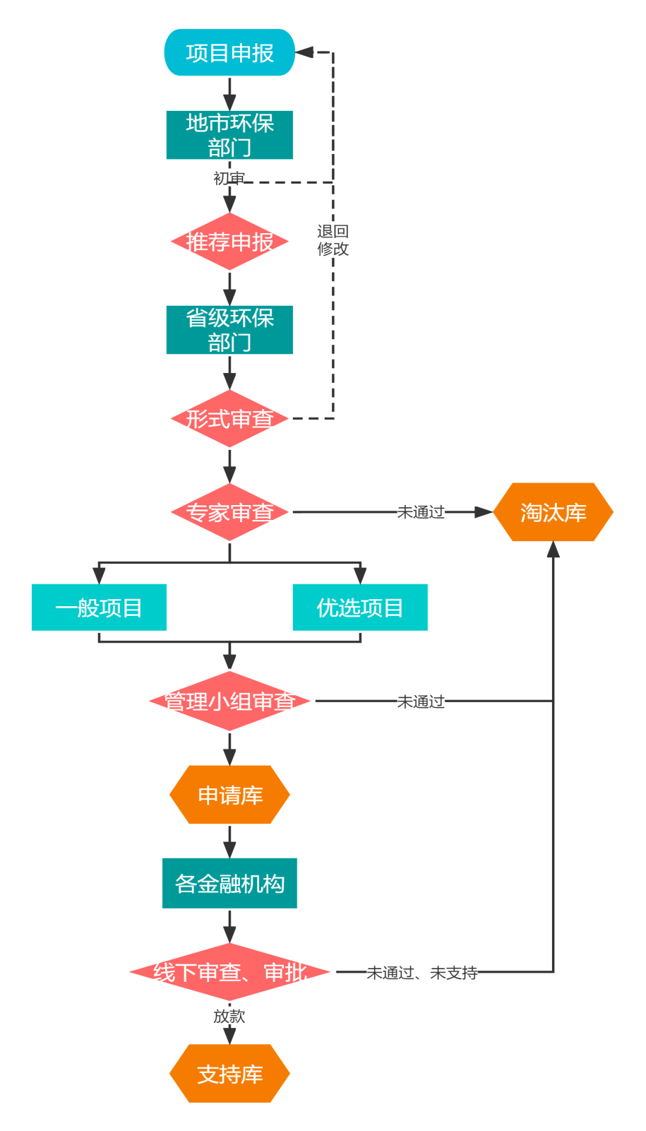 縣級及以上生態環境部門通過生態環保金融支持項目管理系統線上申報,逐級審核通過后,提交至省生態環境廳。省生態環境廳對省市縣生態環境部門提交的項目申報材料開展論證評估,論證通過的項目提交至生態環境部。生態環境部原則上于奇數月15日前向有關金融機構推送項目,于推送當月10日前完成EOD項目入庫指導,對于不符合入庫指南要求的予以退回或調至淘汰庫。有關金融機構對推送項目開展初審,將符合本行(單位)放貸或投資支持條件的項目調入本行(單位)儲備庫,并與有關項目單位溝通對接。