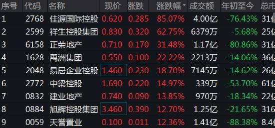 地產股爆發式上漲,佳源國際控股漲85%,祥生控股漲63%,正榮地產漲超30%,中梁控股漲15%,禹洲集團漲20%,建業地產、旭輝控股、天譽置業、新城發展、融信中國等集體漲超10%。
