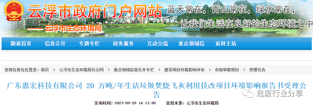 11月6日,云浮市人民政府網站公布廣東惠宏科技有限公司20萬噸/年生活垃圾焚燒飛灰利用技改項目環境影響報告書擬審查公示,該項目擬利用生活垃圾焚燒飛灰制砂,總投資約1.5億元人民幣。