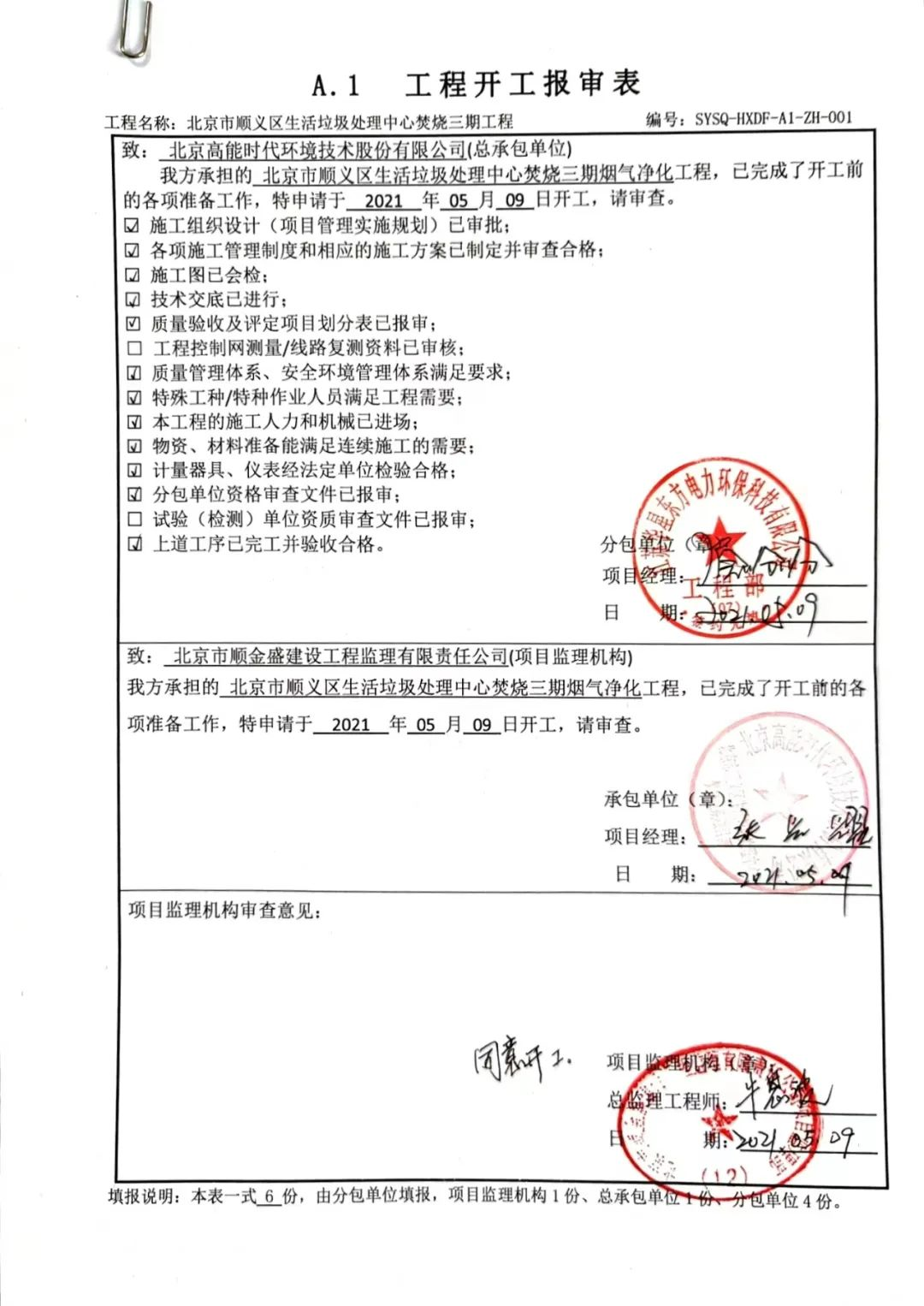 我公司承建(jian)的(de)北京(jing)市順(shun)義生活垃圾焚(fen)燒發電項目三期煙(yan)氣凈化工程于2021年5月9日開工建(jian)設。The flue gas cleaning (FGC) project undertaken by Huaxing for Shunyi WTE Phase III in Beijing was commenced on May 9, 2021.